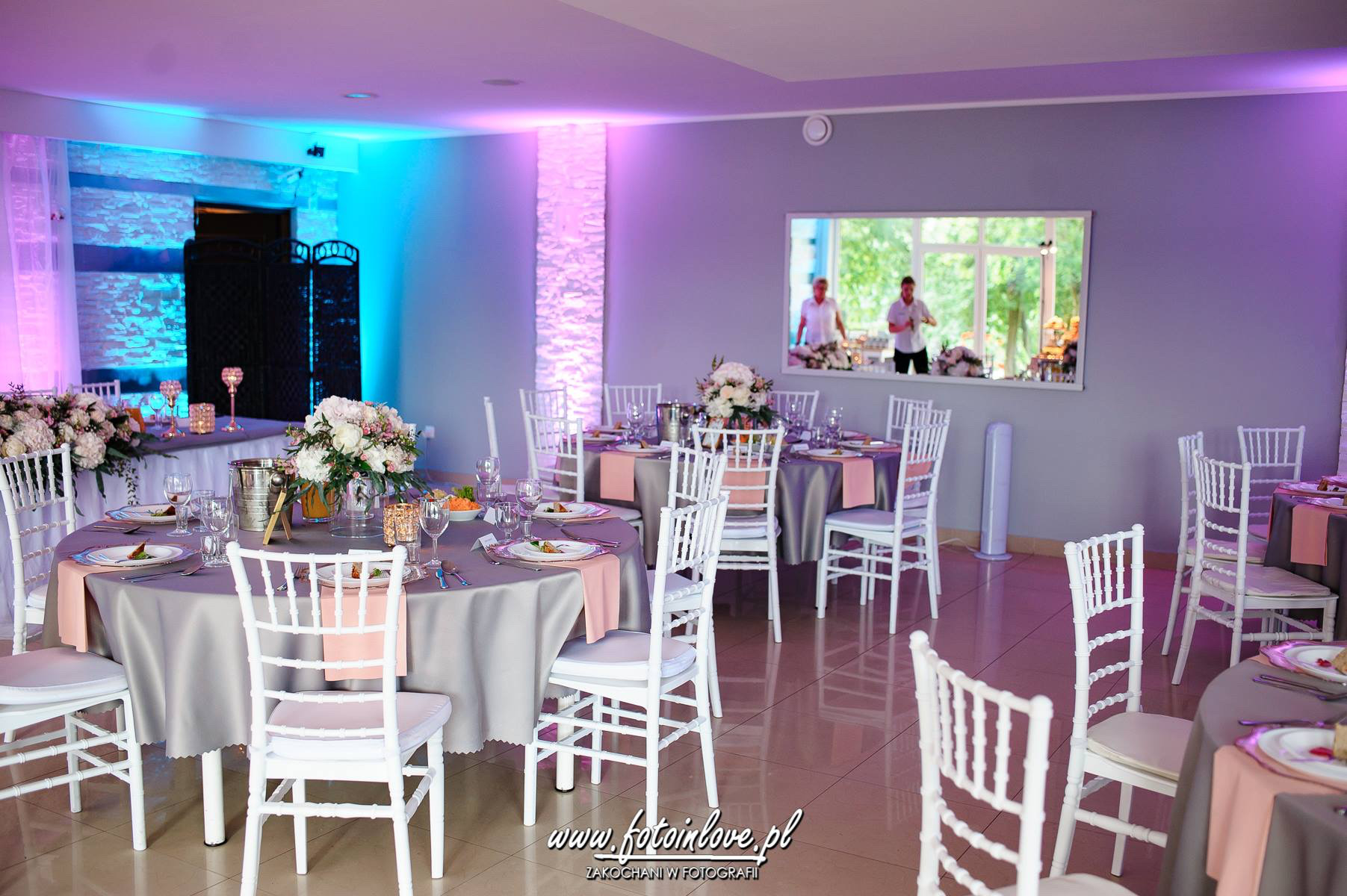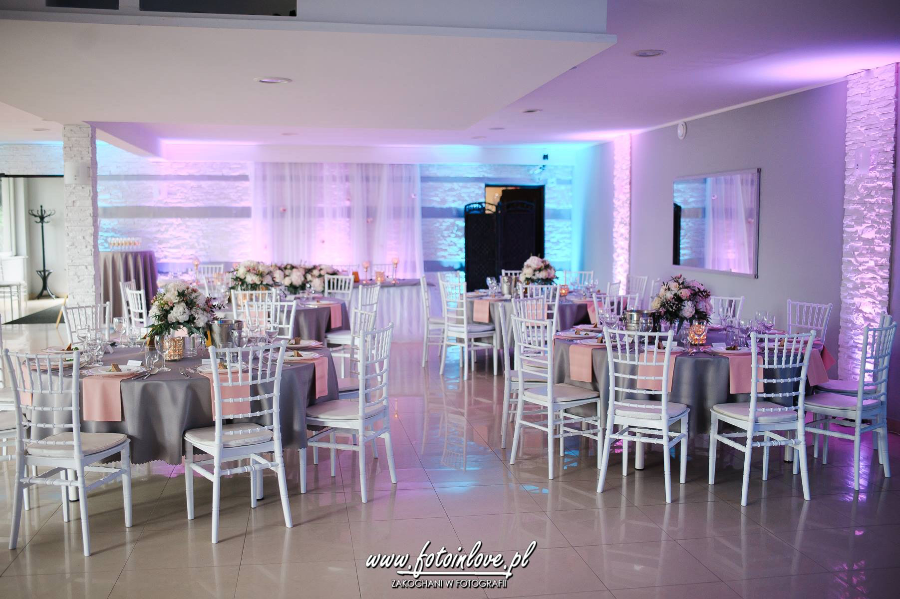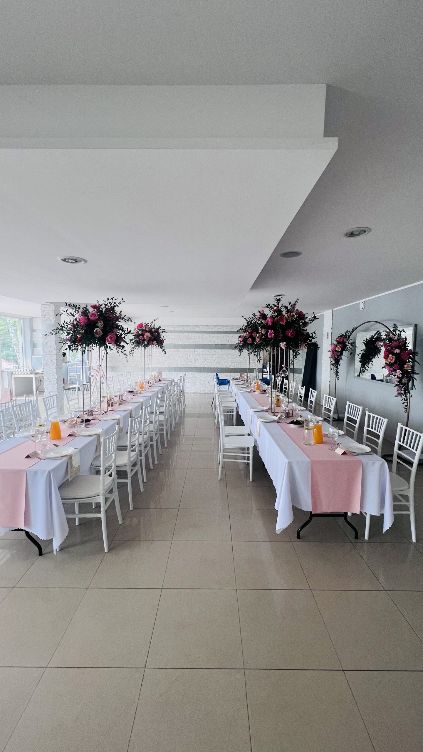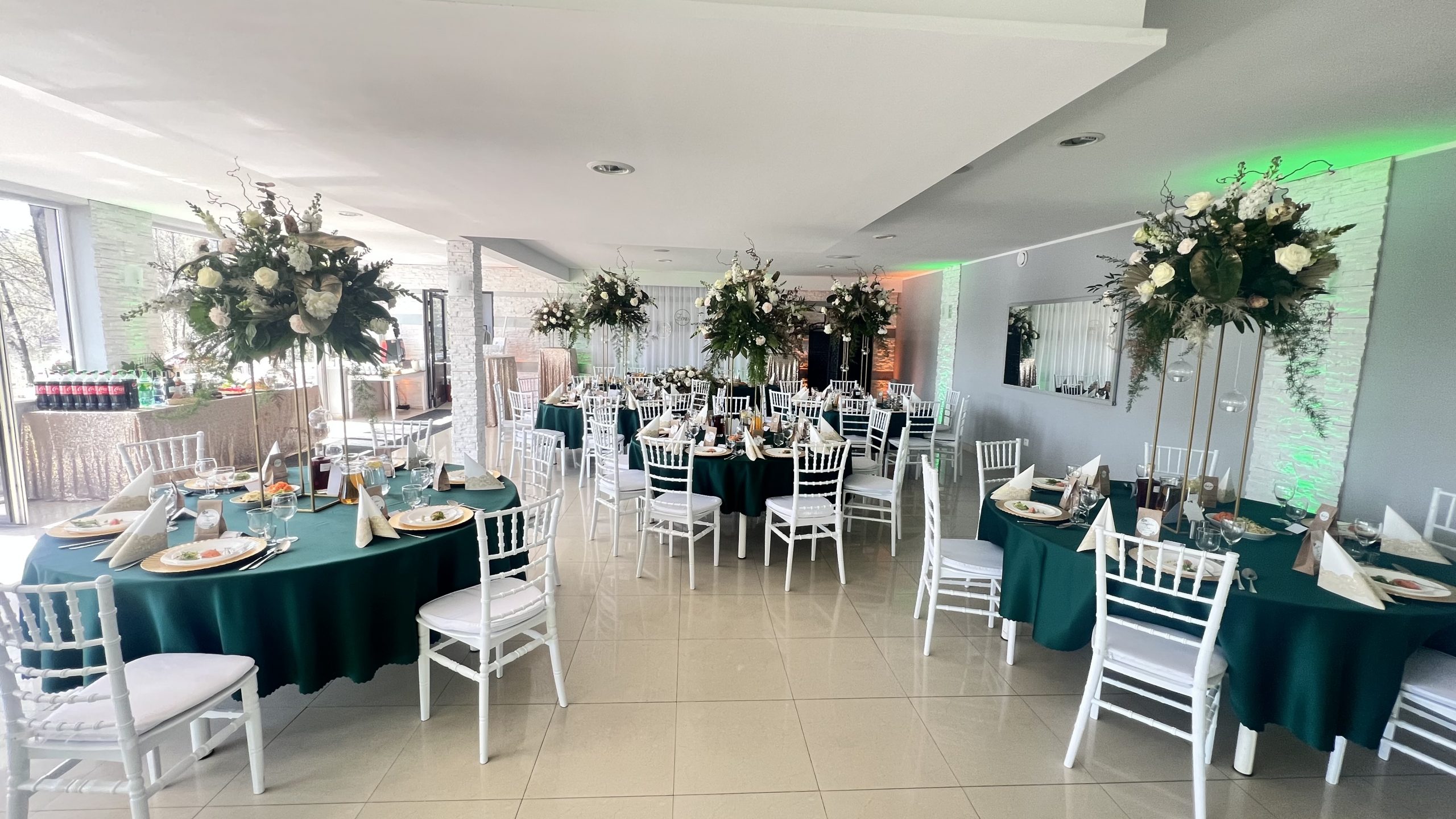 Sala bankietowa z widokiem na jezioro utrzymana w stylu nowoczesnym umożliwia organizację przyjęć do 70 osób. Do dyspozycji gości oddajemy także urokliwy taras widokowy. Istnieje możliwość organizacji przyjęcia weselnego przy okrągłych oraz prostokątnych stołach.